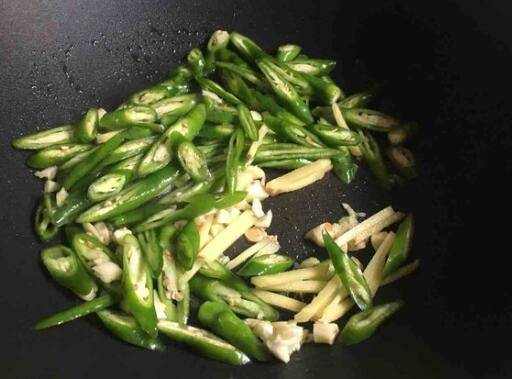 5、起锅热油,倒入生姜、蒜末、辣椒煸香。