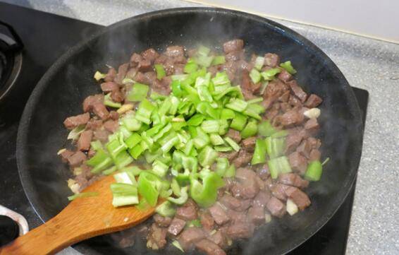 3、待牛肉丁变色时,放入葱姜蒜碎翻炒几下,放入青椒丁翻炒。
