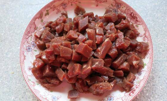 1、将牛排切成1.5cm的粒,葱姜蒜切成碎,青椒切成丁。