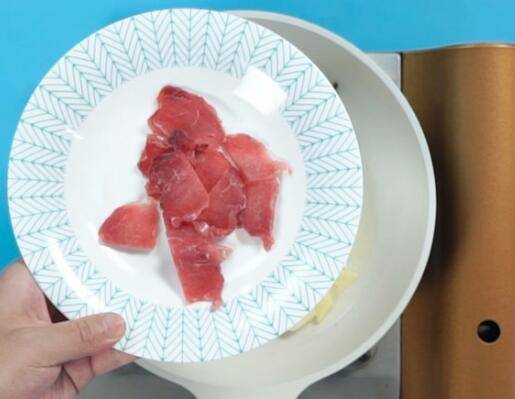 3、放入花椒,倒入猪肉片,翻炒至变色。