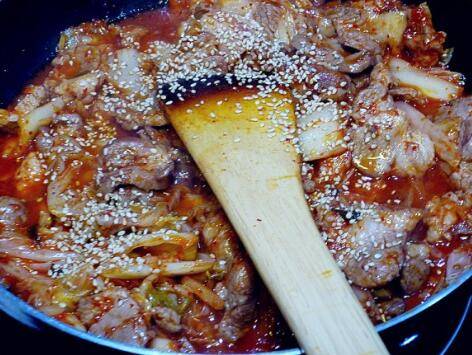4、炒至铲子能轻易插入肉,关火,撒白芝麻即可出锅。