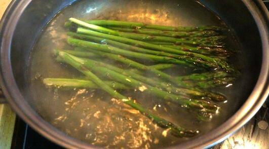 1、芦笋削掉老根、硬皮,洗净,入开水锅中焯到变色,捞出摆盘中。