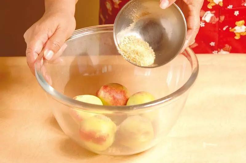 3、桃子中加盐,不停的搓揉桃子约五分钟,搓落表面的细毛。