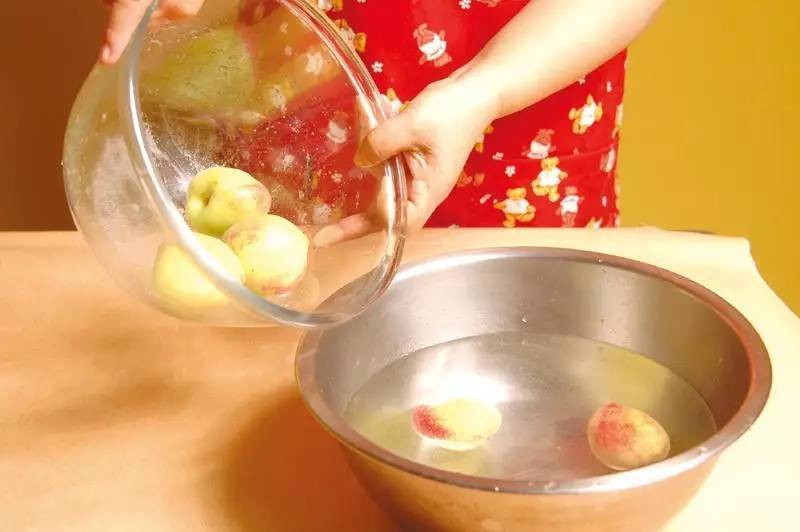 4、接着以冷开水将桃子浸泡一下并沖洗干净后,取出沥干水分备用。