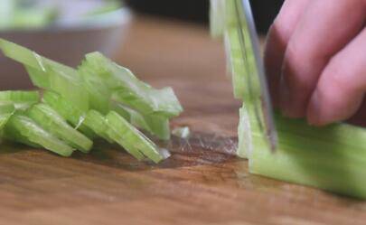 1、西芹、百合非常洗干净,西芹斜切成片、百合掰成小瓣。