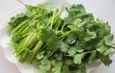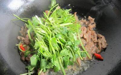 4、加盐翻炒均匀,加香菜关火,翻炒均匀即可。