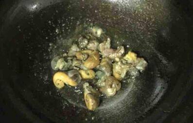 4、花椒炸完捞出扔掉;海螺黄过油盛出放在切好的海螺肉里。