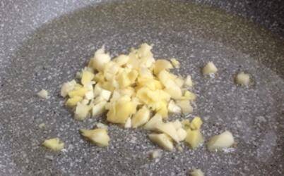 3、热锅下料,油热放姜蒜末,蒜苗头爆香(喜欢吃辣的可以加点干辣椒)。