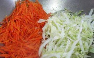 2、先将胡萝卜丝炒香;再放入白菜丝。