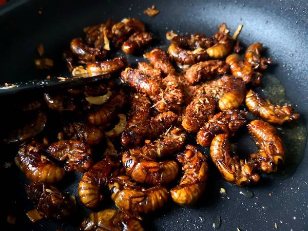 4、把控干水分的蝉放到平底锅里,反复翻炒,让每一个蝉都裹满油。