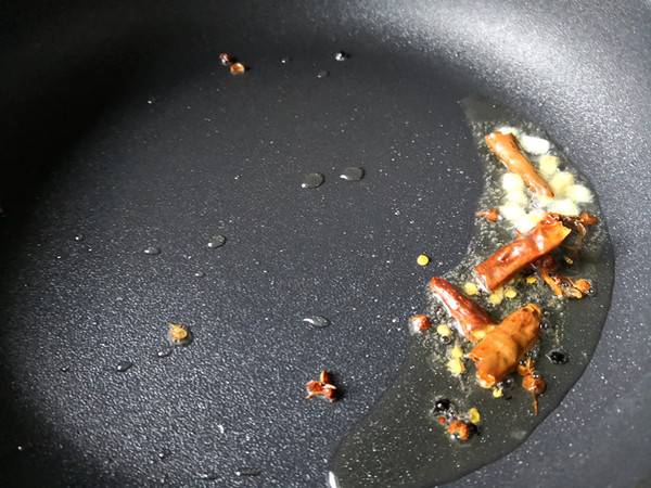 3、干辣椒切开,大蒜切末,平底锅里放入适量的食用油,油热后先把花椒放入锅里爆香,再放入大蒜末和干辣椒炒香。