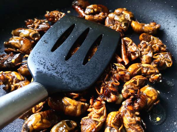 最佳答案:准备材料:蝉200克、食用油适量、烧烤料适量、干辣椒少许、大蒜少许、花椒少许。蝉洗净,沥干,干辣椒切开,大蒜切末,平底锅放入适量食用油,油热后放入花椒爆香,再放入大蒜末和干辣椒炒香。将蝉放入平底锅里,反复翻炒,让每一个蝉都裹满油。用铲子把锅里蝉按扁,让蝉尽量与平底锅接触。