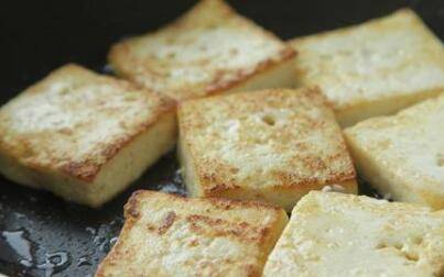 2、锅中放入适量的油烧热豆腐切小块放入去煎;小火慢煎。