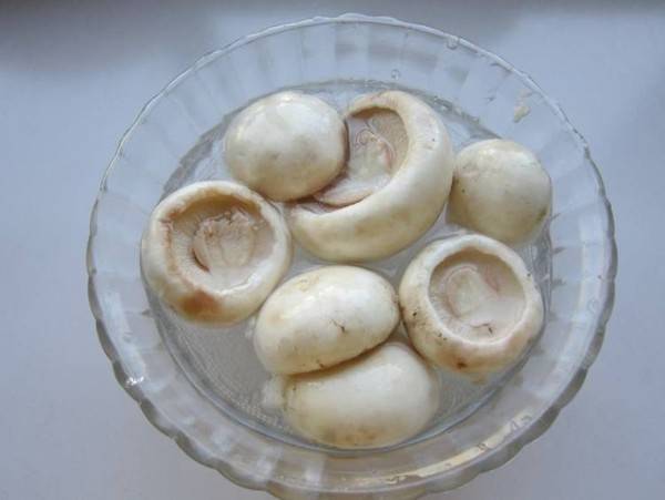 4、圆菇用淡盐水侵泡洗净去蒂,切片。