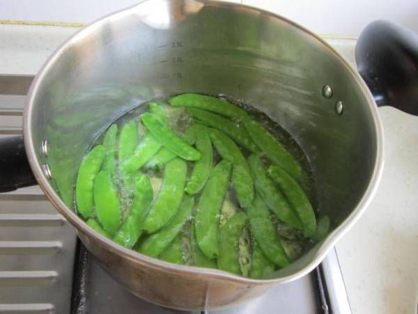2、把荷兰豆去掉筋尾洗净,开水里加几滴植物油焯烫2分钟捞起,用凉水过凉捞起沥干水分。