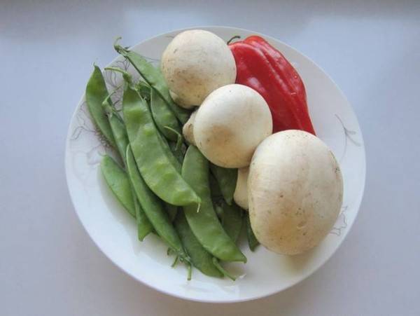 1、准备材料:荷兰豆200克、圆菇150克、植物油适量、盐适量、青红辣椒2个、生抽5克、蚝油5克、鸡精1克。