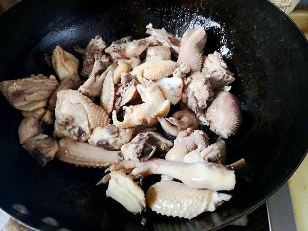 8、鸡块炖好后,大火收汁,将鸡块取出来,另起锅油热后先放辣椒翻炒出香味,再把鸡块倒入一起翻炒,加少许盐调味,出锅即可。