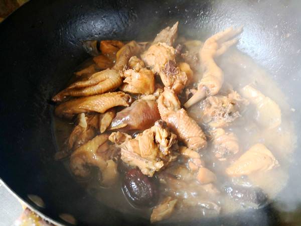 6、加入1勺老抽增色,再加入适量的清水放入丁香、肉扣、凉姜、白芷、桂皮,大葱切段和姜片一起放入锅里大火烧开再小火慢炖,直至将鸡肉炖至熟透软烂。