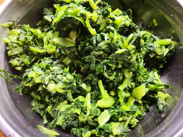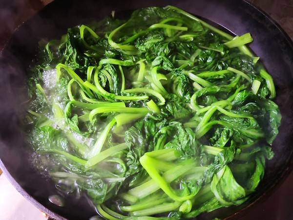 2、小白菜洗干净后,锅里添入适量清水,水烧开后把小白菜放入锅里,焯水断生。