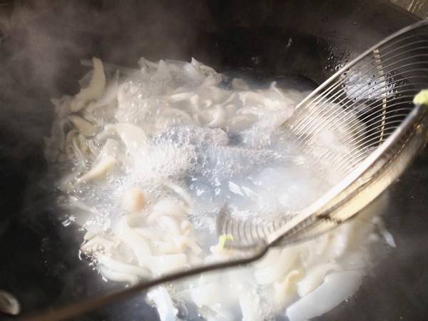 7、锅里加入适量的清水,水开后,锅里加入一点盐,再把墨鱼片放入其中,大约30秒左右取出来。