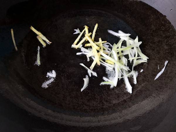 9、炒锅里加入适量的食用油,油热后先放入葱丝、姜丝爆香。