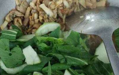 4、下入蛏子炒变色;加入适量料酒、适量生抽,加入切好的青菜。