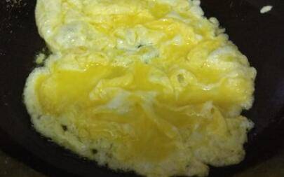 2、把事先打好的鸡蛋液倒入锅内翻炒成小块盛出。