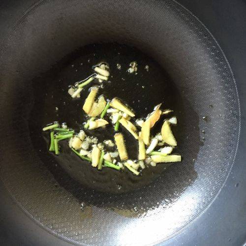 4、另起一炒锅,放油,油热后放入姜葱蒜,爆出香味。