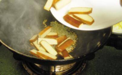 3、放入豆腐干,香肠,翻炒一会。放包心菜,最后把泡好的米面倒入。