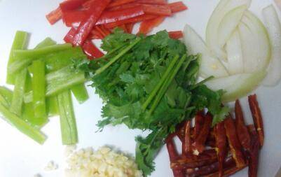 3、青红椒切条,香菜切段,洋葱切条,干辣椒顺长切开去籽,蒜切末。