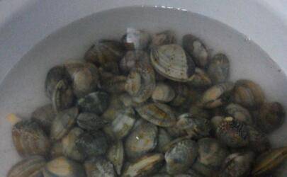 1、蚬子事先用淡盐水泡十分钟,以去除蚬子中的泥沙,洗净。