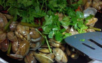 用料:蚬子,尖椒,香菜,红尖椒,洋葱。