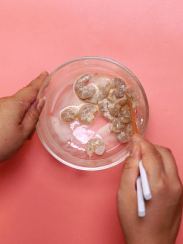 2、虾仁中放料酒、淀粉,搅拌均匀,腌制10分钟。