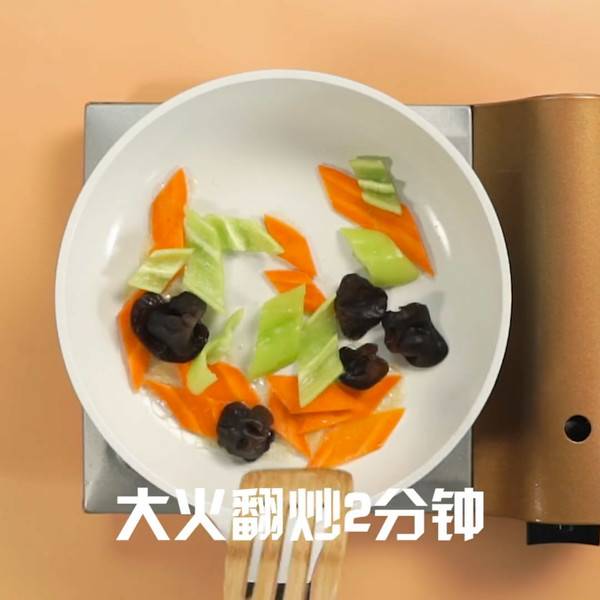 5、捞出豆腐,倒入青辣椒、胡萝卜、木耳,大火翻炒2分钟。