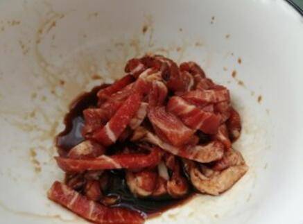 1、将肉加入生抽老抽料酒淀粉腌制一下。