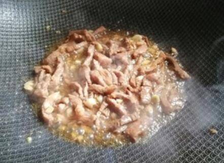 3、锅中倒油,放蒜末,下腌好的肉下锅炒,炒完后盛起。