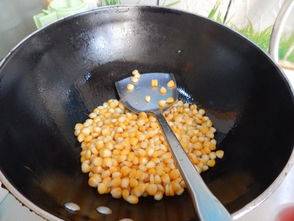 3、热油锅,放进玉米粒,煽炒1分钟。