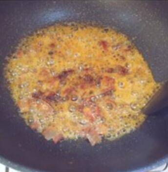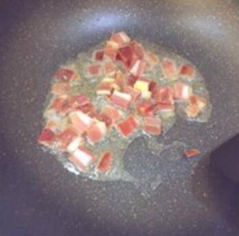 3、火腿、豌豆尖放入锅中多炒一下,微干会香一些。