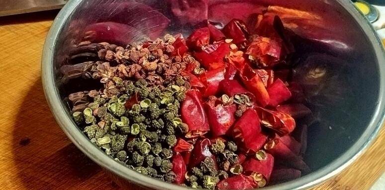 准备材料:干辣椒100克、鸡大腿1个、花椒20克、小葱3根、菜籽油3茶匙、料酒2茶匙、白芝麻1茶匙、盐1勺、胡椒粉半勺、鸡精半勺。