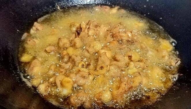 5、锅中倒油、烧至四五成热,倒入鸡肉丁,中火炸至油泡变小后捞出。