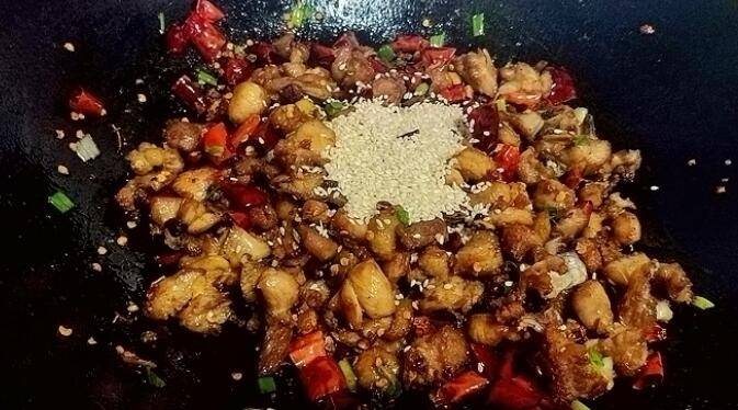 8、倒入鸡肉丁翻炒;放盐、鸡精、葱颗翻炒;放熟白芝麻;大火翻炒均匀出锅即可。
