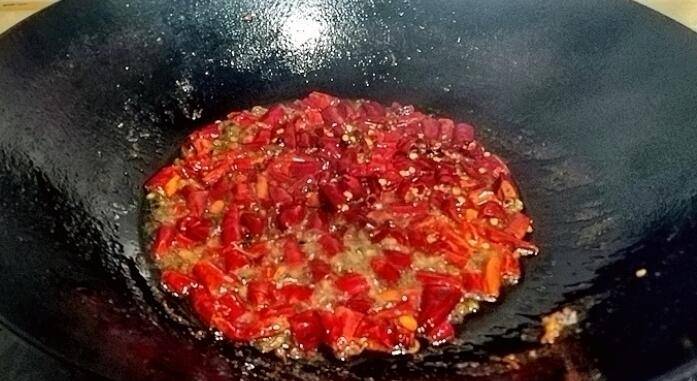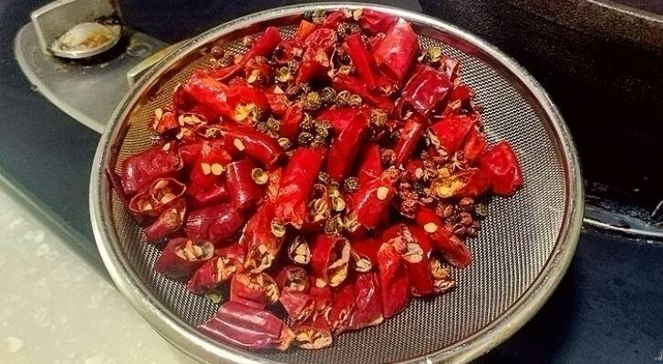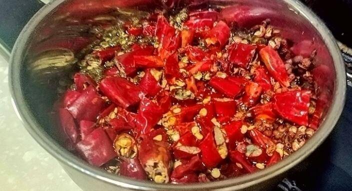 7、倒出多余油,小火、倒入海椒、花椒炸出辣香味。