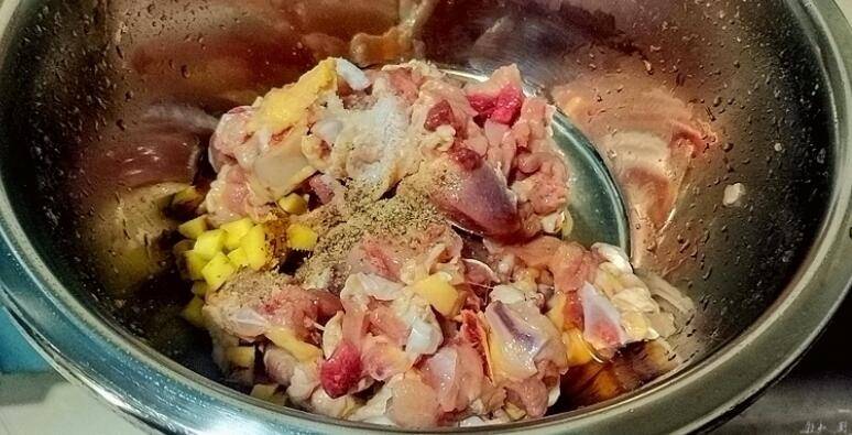 1、鸡腿切肉丁,清水浸泡,挤去血水、沥水,放盐、胡椒粉、料酒,抓均匀。