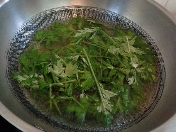 4、随后锅中滚油,放进新鮮艾草叶煸炒。