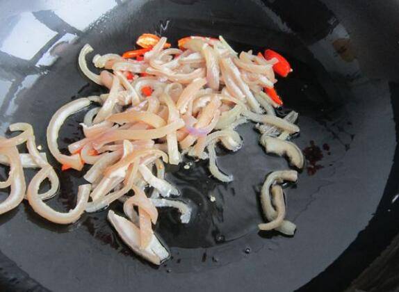 材料:酸菜400克、卤肉皮200克、植物油适量、盐适量、小米椒4个、生抽5克。