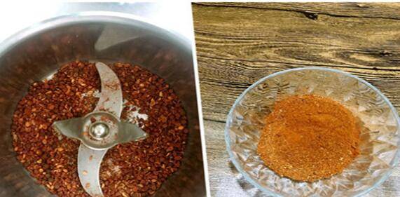 1、胭脂红籽、香菜籽、黑胡椒籽、孜然籽、丁香粒、牛至放进研磨器中,打成粉末。