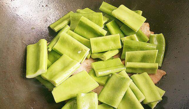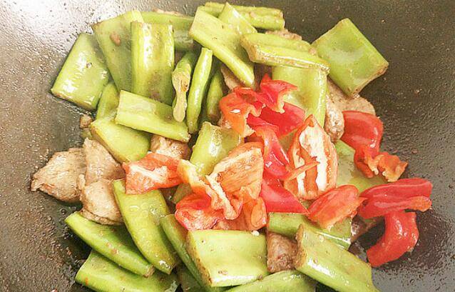4、肉炒入味后,加入刀豆,炒几下加入辣椒粉。