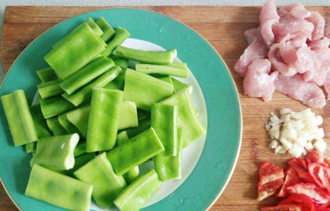 1、刀豆洗净切段,瘦肉切片,蒜瓣去皮切碎,红辣椒切块。