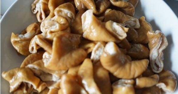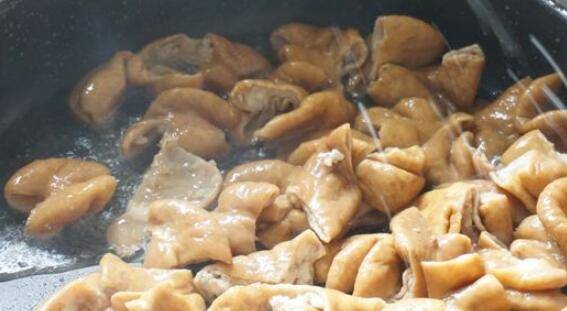 3、热锅油8成热放入切好的肥肠,煎至外表变干成深黄色。