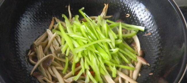 5、炒至收汁,基本也就熟了,接着将青椒丝倒入翻炒片刻。